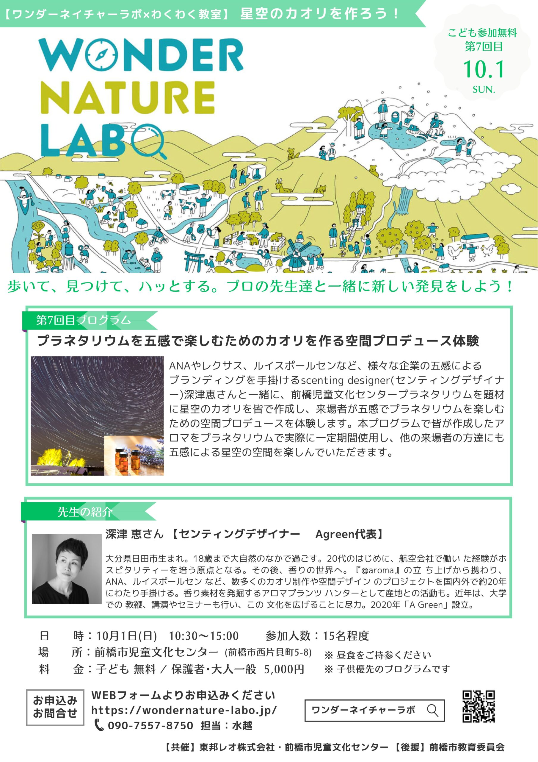 ANAやレクサス、ルイスポールセンなど、様々な企業の五感によるブランディングを手掛けるscenting designer(センティングデザイナー)深津恵さんと一緒に、前橋児童文化センタープラネタリウムを題材に星空のカオリを皆で作成し、来場者が五感でプラネタリウムを楽しむための空間プロデュースを体験します。本プログラムで皆が作成したアロマをプラネタリウムで実際に一定期間使用し、他の来場者の方達にも五感による星空の空間を楽しんでいただきます。