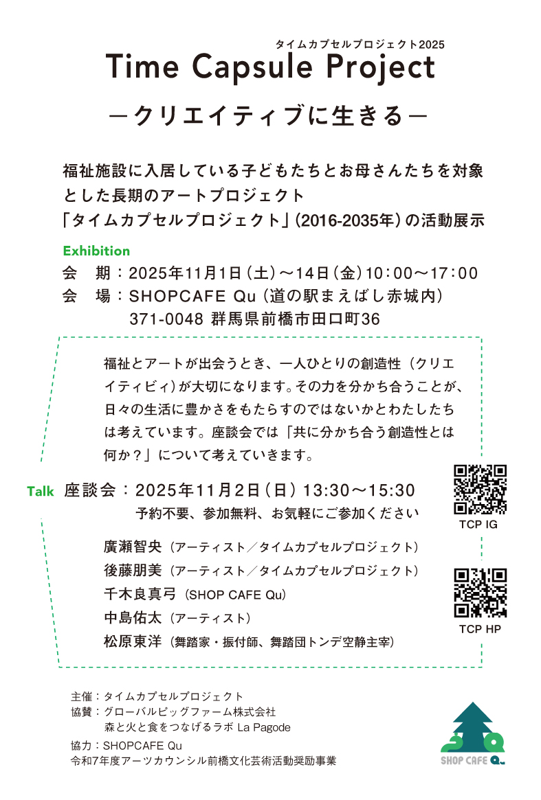 | 主 催 | 主催:タイムカプセルプロジェクト 協賛:グローバルピッグファーム株式会社、森と火と食をつなげるラボ La Pagode 協力:SHOPCAFE Qu 令和7年度アーツカウンシル前橋文化芸術活動奨励事業 |