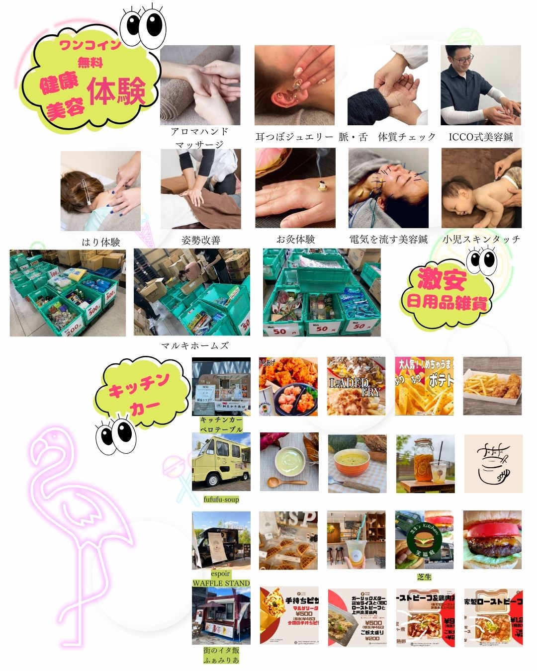 申し込みなし日用品や野菜販売、キッチンカーや体験ブース、ワークショップなど