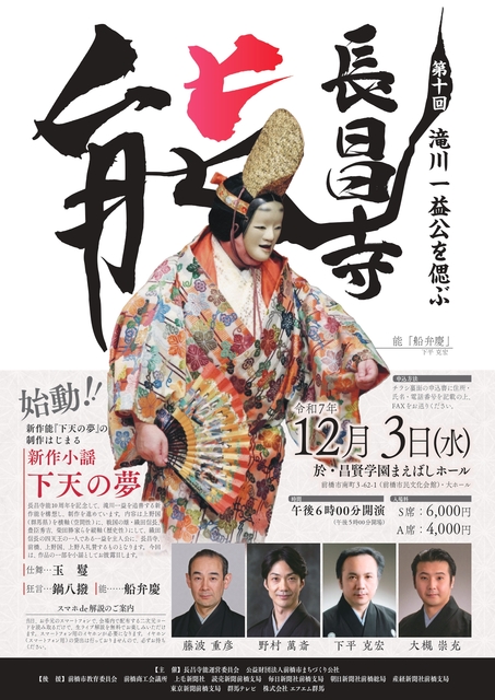 | 内 容 | 1582年6月11日、織田信長の命により関東管領として厩橋に赴任した滝川一益公は、新築された長昌寺の庭に能舞台を造り、近隣の土豪や町民を集め長男於長と能を舞い、京の都の文化を見せ、文武兼ね備えた大名である事を誇示いたしました。これが記録に残る上州に於ける最初の能興行でした。 約400年の時を越え、今当時の能舞台が前橋に甦ります。 能楽の醍醐味を、心ゆくまで御堪能ください。 【出演】 |