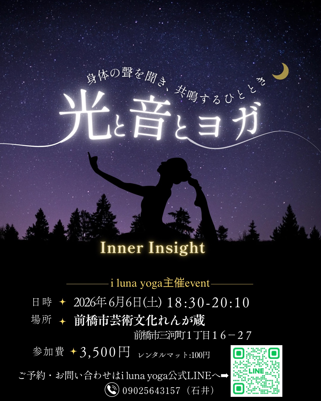 | お問合せ先 | i luna yoga公式LINE https://lin.ee/gEqiDgK 09025643157(石井) |