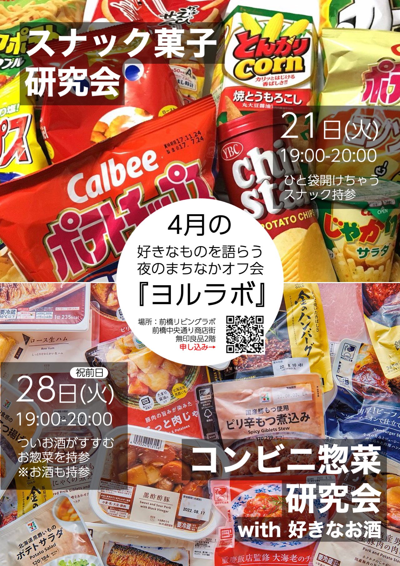 | 内 容 | 今回のヨルラボは、スーパーやコンビニで、ついつい手に取ってしまう「スナック菓子」。気がついたら、ひと袋開けてしまう・・・そんな、推しスナックをみんなで語る会です。 |